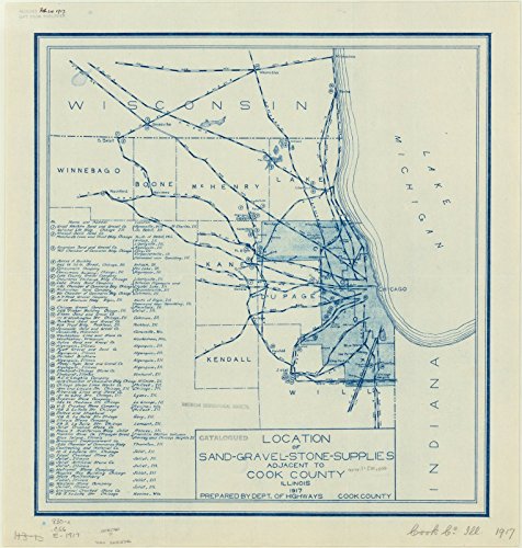 1917年のクック郡イリノイ州の歴史地図。砂利や石材の配置が詳細に示され、アンティークな雰囲気。サイズは44in x 44inの複製版です。
