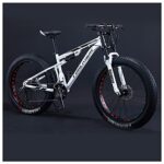 NENGGE 26インチマウンテンバイクはフルサスペンションで、ビーチや雪など全地形に対応。最大負荷200kg、7速ギア搭載。ホワイトスポークが特徴的。