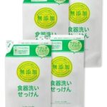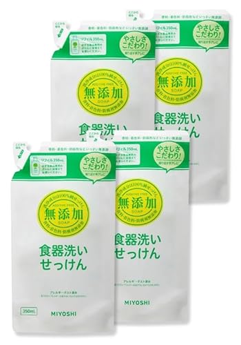 無添加無香料の食器洗いせっけん。せっけん成分を使用し、敏感肌や手肌にもやさしい設計。350mlの詰替えパックが4個セットで、食器洗いに最適です。環境にも配慮した製品です。
