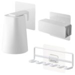 山崎実業の歯ブラシホルダー、マグネットタンブラー、歯磨き粉チューブホルダーの3点セット。浮かせる収納で洗面台がスッキリ。フィルムフック付きで簡単取り付け。カラーはホワイト。