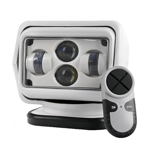 WGMサーチライトは、IP67防水の60W LEDで6800ルーメンの明るさ。リモコン操作可能で、屋外やマリン用途に最適。寿命は50000時間以上。