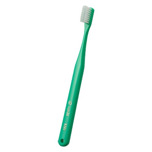 オーラルケア タフト24歯ブラシは、グリーンのソフト毛タイプで、歯周ポケットにも届きやすい設計。キャップなしで持ち運びに便利。使い心地が良く、口腔内の隅々までしっかりケアできる。
