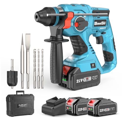 Seesiiコードレスロータリーハンマードリルは、3-in-1機能搭載で、2 x 4.0Ahバッテリーと充電器付き。2.1Jの強力ブラシレスモーター、SDS-Plus対応で家庭や建設作業に最適。