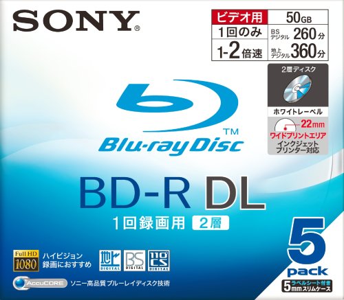 SONY製のビデオ用BD-Rは、追記型の片面2層で容量は50GB、2倍速で書き込み可能です。プリンタブル仕様で、5枚入りパックです。高品質な映像保存に適しています。