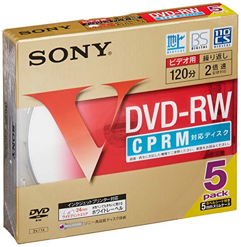 ソニーのビデオ用DVD-RW 120分、1-2倍速、5mmケースの5枚パック。再書き込み可能で、高い信頼性を誇ります。家庭での映像保存やデータバックアップに最適なメディア。
