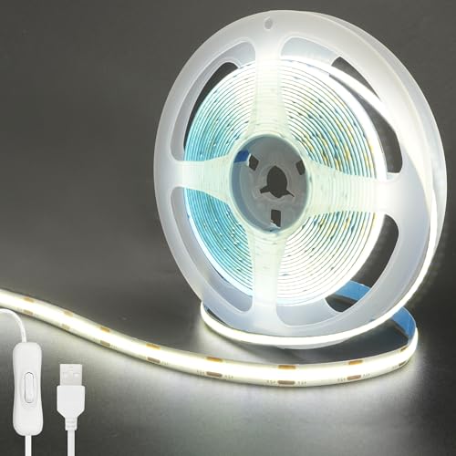 クリアヒルの5V COB LEDストリップライト(2M)は、昼白色6500Kで320LED/m、3.5W/mの省エネ性能。幅8mm、非防水IP20、DIYに最適なUSBスイッチ付き。