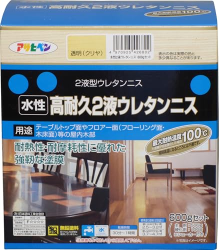 アサヒペン 水性高耐久2液ウレタンニス 600gセットは、優れた耐久性を持つ透明な仕上げ用ニスです。水性であり、においが少なく、木材や合成樹脂に適しています。細かい仕上げが可能で、丁寧な塗装が実現します。