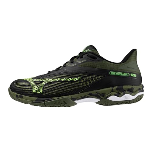 ミズノのテニスシューズ、ウエーブエクシードライト2 OCはクレー・砂入り人工芝コート向け。軽量設計で、部活動やソフトテニス、硬式テニスにも最適。カラーはブラック×ホワイト×カーキ、サイズは25.5cm、3Eです。