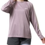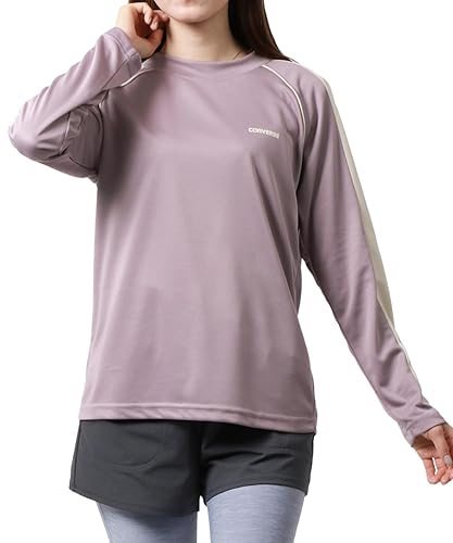 コンバースのレディース長袖Tシャツ。メッシュ素材で吸汗速乾性があり、UVカット機能付き。モックネックデザインで、スポーツやトレーニングに最適。カラーはラベンダー、サイズはMです。