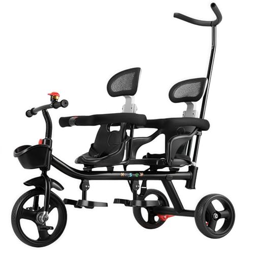Banefuの三輪車は、手押し棒付きで二人乗り可能。ペダル式で、炭素鋼フレームを使用。耐荷重90KG、1-7歳の子供向け。屋外遊びに最適な誕生日やお祝いギフトにおすすめ。