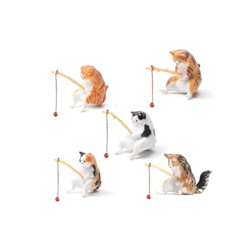釣り猫の置物5匹セット。リアルな樹脂製猫フィギュアで、アクアリウムや水槽の装飾に最適。和風デザインで癒しの空間を演出。店舗飾りやインテリアにもおすすめ。