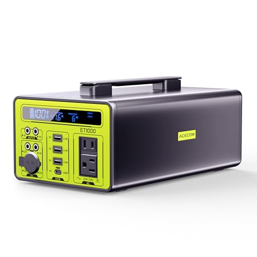Acecow ポータブル電源 ET1000は69600mAh/1030Whの大容量で、AC1000W(瞬間最大2000W)出力。6倍長寿命のBMS電池保護を搭載し、ソーラー充電も可能。軽量8.2kgで、車中泊やキャンプ、非常用電源に最適。