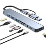Zacoora 8-in-2 USB C ハブは、複数のポートを提供し、データ転送やHDMI出力、SDカードリーダーなど多機能が充実。コンパクトで持ち運びにも便利なデザインが特徴です。