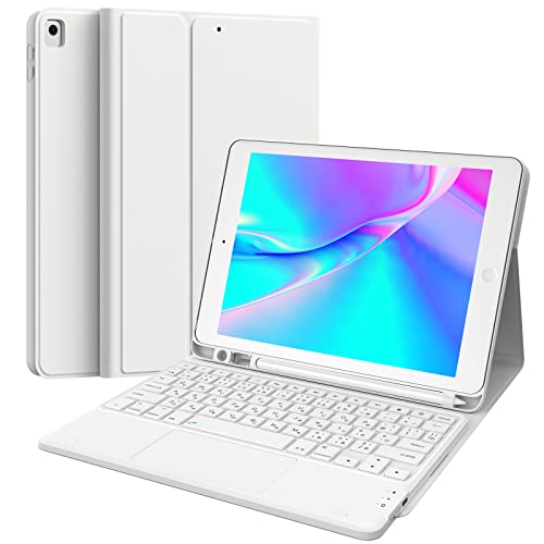 Earto iPadキーボードは9世代、8世代、7世代対応。JIS配列、日本語。タッチパッド付き、脱着式で角度調整可能。ペンシルホルダー、Type-C充電式、マグネット付き。対応機種:iPad 10.2/10.5/Air3/Pro 10.5(2017)、ホワイト。
