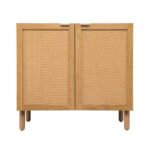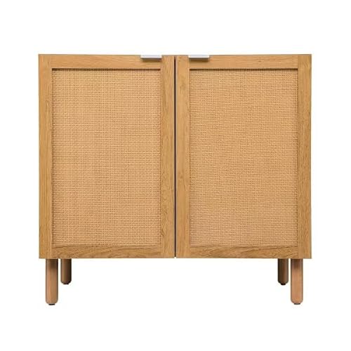 Sango Orre 2ドアキャビネットは、モダンブラウンのデザインで合成ラタン製のドアパネルを採用。調節可能な棚や円筒形の木製の脚が特徴です。リビングやダイニングルームに最適なエレガントな収納家具.