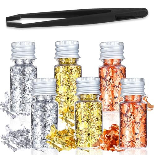 6ボトルのゴールドリーフ装飾。ケーキやチョコレートのデコレーションに最適な金箔フレーク。DIYクラフトやネイルアートに使えるピンセット付き。3色展開。