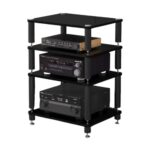 WXQメディアスタンドは、ブラックの4層デザインで、オーディオ機器やスピーカーを収納するための頑丈でスタイリッシュなラックです。パワーアンプキャビネットとしても使用可能で、ホームオーディオシステムに最適です。