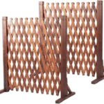 天然木製のガーデンフェンス。伸縮・折りたたみ式で、70x160cmのコンパクトサイズ。炭化表面処理により防虫・防食効果あり。室内外問わず使用可能なブラウンのフェンス2個セット。