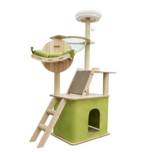Heyblyキャットタワーは、高さ200cmで超スリムな設計。2つのハンモックや大きな見晴らし台もあり、天然麻紐の爪研ぎ棒、給餌台付き。多頭飼いや大きな猫に最適な省スペースタイプ。