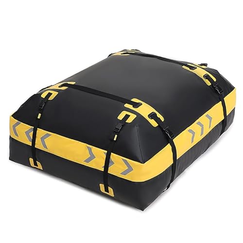 フィスカー オーシャンエクストリーム 2023-2025対応の大容量防水ルーフキャリアバッグ。サイズ110×90×40cm、カラーはブラック&イエロー。簡単取り付けで、旅行やアウトドアに最適。