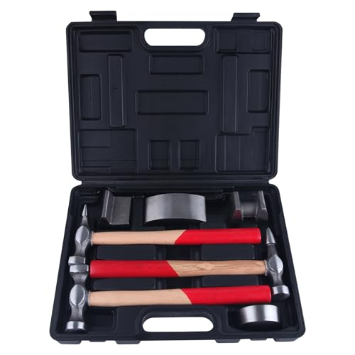 LEONTOOL 板金ハンマーセットは、ハンマー3種とドーリー4種が揃った7点セットです。車両修理や鈑金修正に最適で、ポリッシュタイプのハンマーが含まれ、メンテナンスに便利な収納ボックス付きです。