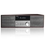 CDプレーヤー、40W出力のコンパクトコンポーネントシステム。FMラジオ、Bluetooth対応、USB/AUX入力、ヘッドフォンジャックあり。日本語リモコン付きのウッドキャビネット(ウォールナット、ブラウン)デザイン。