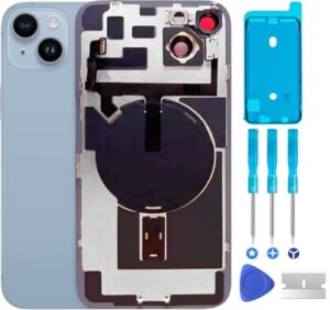 ABUSVEX オリジナル iPhone 14 バックガラス交換用&プレート&フレックスケーブルとすべての部品、iPhone14用カメラフレームと修理ツール(ブルー)