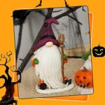 カボチャのほうきや紫色の帽子をかぶったウィザードの樹脂製ハロウィーン置物。屋内外のテーブルトップデコレーションに最適!