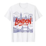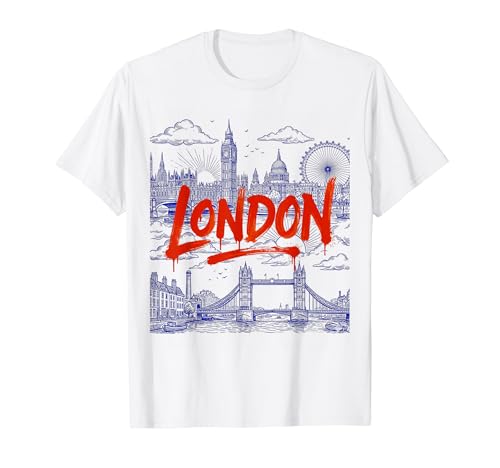 ロンドンの街並みのイラストと太字のペイントテキスト。 Tシャツの製品情報
