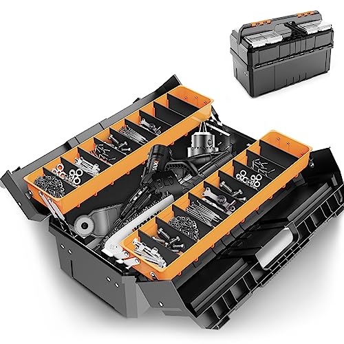 大容量の2段折りたたみ式工具箱。両開き、取っ手付きで持ち運びに便利。金具でしっかり収納、システム収納BOXとしても使え、積み重ね可能なタックルボックス。電動工具や小物の整理に最適。