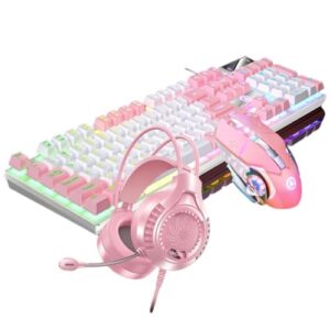 メカニカルタッチキーボード USB有線 パソコン用 デスクトップ ゲーミングオフィス用 マウス ヘッドセットセット 低音静音設計 (ホワイト/ピンク)