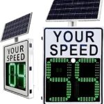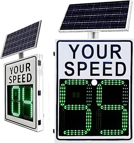 ソーラー電源内蔵のLEDレーダー速度標識。サイズは23.5インチ×25.5インチまたは24インチ×35インチ。高速道路や速度制限道路向け、付属品付き。