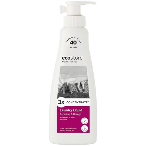 ecostore(エコストア)ランドリーコンセントレートポンプは、ゼラニウム&オレンジの香りが特徴の480mLの洗濯洗剤です。3倍濃縮で、植物由来の成分を使用し、肌にやさしい設計。
