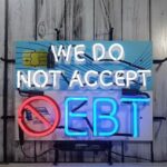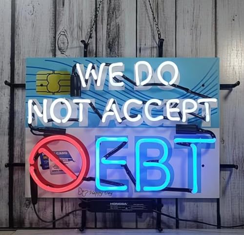 ハンドメイドの本物のガラス製ネオンチューブのサイン「We Do Not Accept Ebt」。サイズは24 x 20インチで、高解像度のジェットグラフィック印刷ボードを使用。ホームバーやマンケイブ、レストランに最適。