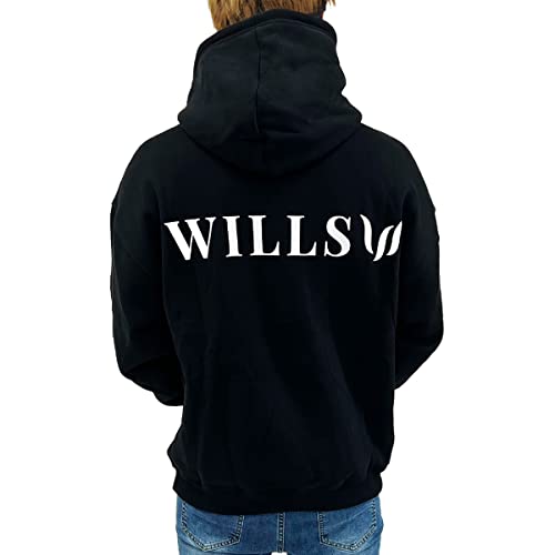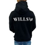 WILLS FITNESSのオーバーサイズプルオーバーパーカー。バックプリント付きで筋トレに最適。ストレッチ性のあるコットン素材。サイズXL、ブラック。