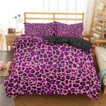 ピンクのヒョウ柄布団カバーシングル3点セット。ポリエステル素材で防ダニ・抗菌・防臭。肌触り良く、通気性・吸湿性に優れ、四季に対応。サイズ: 布団カバー170x210cm、枕カバー2枚(43x63cm)。