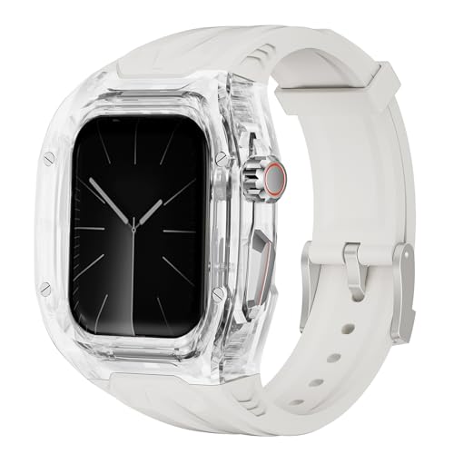 LIRUWECHの3in1一体型デザインApple Watchバンドとケースは、49mm/45mm/44mm/42mm/41mm/40mmに対応。Ultra2/Ultra/9/SE/8/7/6/5/4にフィットし、スターライトバンドとクリアケースの組み合わせ。