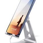 Lomicallスマホスタンドはアルミ製で角度調整可能。卓上やデスクに最適で、iPhoneやAndroid端末に対応。シルバー色、横置き・縦置きが可能。