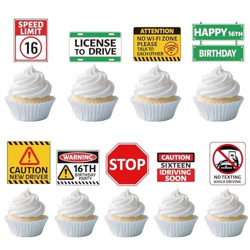 Inisajace運転免許証テーマの16歳誕生日デコレーション。男の子向けのカップケーキトッパーや道路標識ピックで、楽しいパーティーを演出。