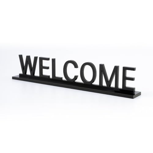 サインジャパンのアクリル置き型サインプレート「WELCOME」は、スタンドタイプで立体的なデザイン。ブラックのモダンな仕上げが特徴で、どんな空間にもマッチします。
