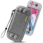 任天堂スイッチライト対応のtomtocハードケース。耐衝撃性、薄型デザインで、撥水表面。ゲーム8枚収納可能。ジョイコン全保護、ストラップ付き、落下試験済みで安心。カラーはターコイズ。