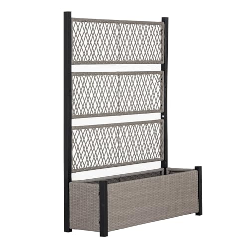 フェンスとプランターボックスが一体化した目隠し・間仕切り。ラタン調でおしゃれなデザイン。幅120cm、高さ149cm。屋外エクステリアに最適で、庭を引き立てます。