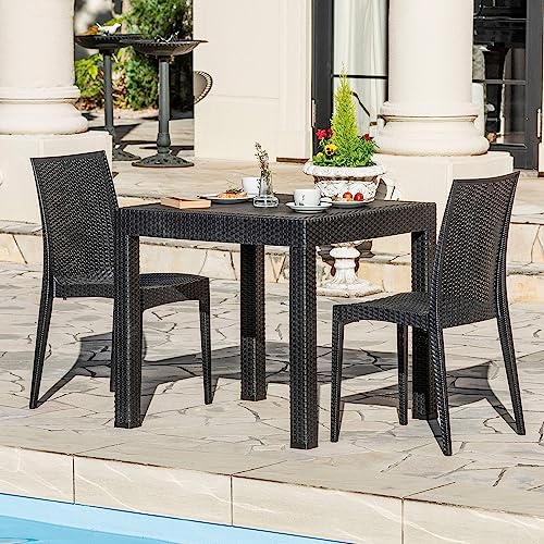 株式会社三栄コーポレーションのガーデンテーブルとチェア3点セットです。W80のテーブルに、肘なしチェアが2脚付属。カラーはシックなブラックで、屋外での使用に最適なデザインです。