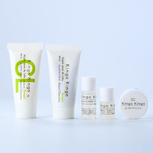 てんげん KingoKingoお試し5点セットは、洗顔、クレンジングジェル、化粧水、美容液、クリームのトライアルキットです。ミニサイズで、保湿や潤いを与え、肌のキメを整える美容成分が配合されています。