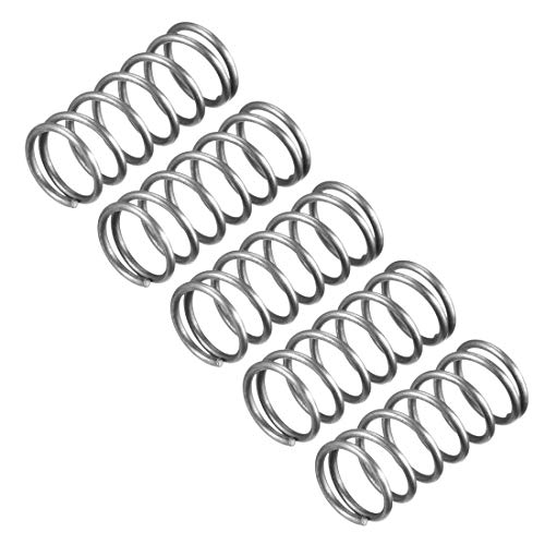 uxcellの圧縮ばねは、ばね鋼製で、線径0.9mm、外径9mm、自由長20mmのコイル延長型です。5個入りで、様々な用途に適しています。