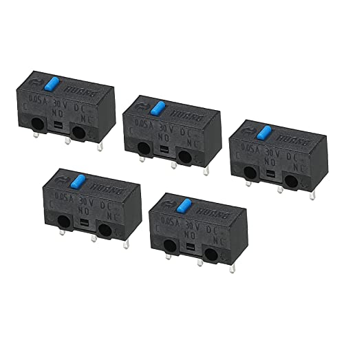 uxcellのマイクロスイッチは、0.78Nで1000万回の耐久性を持ち、3ピン仕様。ブルーのトグル軸とブラックシェルが特徴。ゲーム用マウスの修理交換に最適な5個セットです。