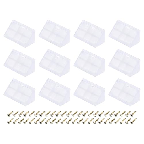 uxcellの90度プラスチックコーナーブレースは、20x42x20mmの直角ブラケットで、棚やキャビネットの強化に最適です。ネジ付きで透明なデザインが特徴です。12個入り。