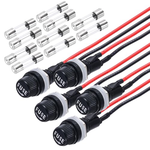 uxcellのヒューズホルダーは、5個セットで、5x20mmのグラス管ヒューズ(10/15A DC 125/250V)付き。取り付けが簡単なリング端子ねじキャップ付きで、予め半田付けされたワイヤーが便利です。