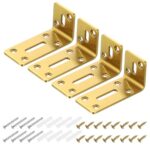 uxcellの4個セットL字型アングルブラケットは、8cmサイズでネジ付き、調節可能なスロットを備えています。キャビネットや棚、家具の固定・補強に最適な金色のステンレス製です。