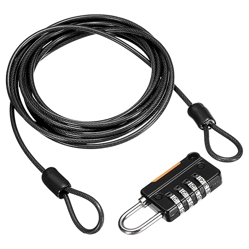 uxcellのセキュリティスチールケーブルは、4桁のダイヤル式組み合わせロックを採用し、2mの黒コーティング済みワイヤーで耐久性が高いです。